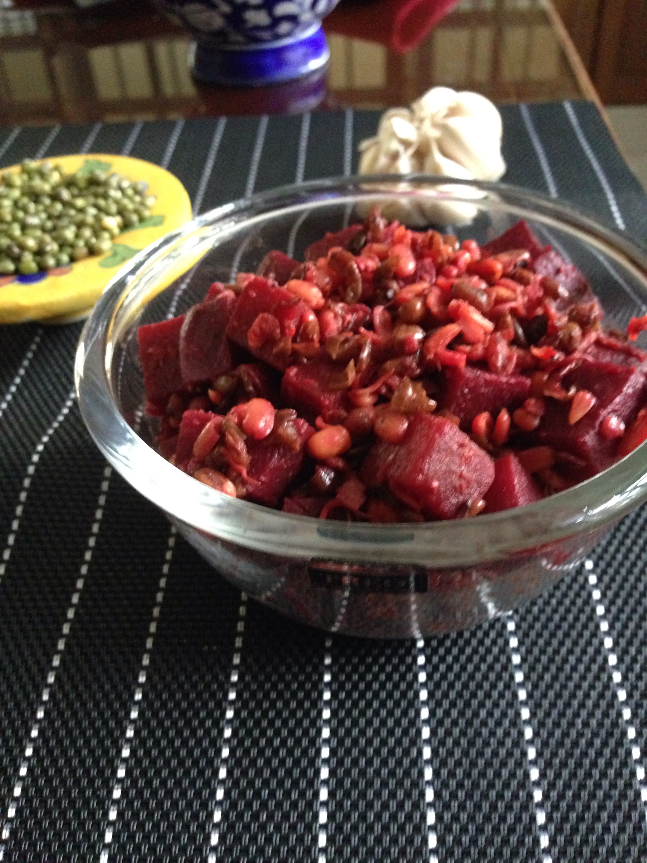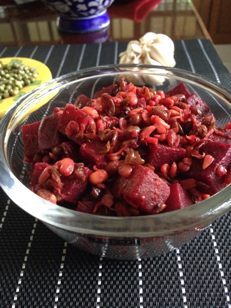 One issue I have is that I don’t get all ingredients here and so I keep trying to make a best case substitutions but this recipe did not need any substitutions and it turned out quite wonderful. I never thought of combining beetroot with sprouts before but it does seem to be a good idea.