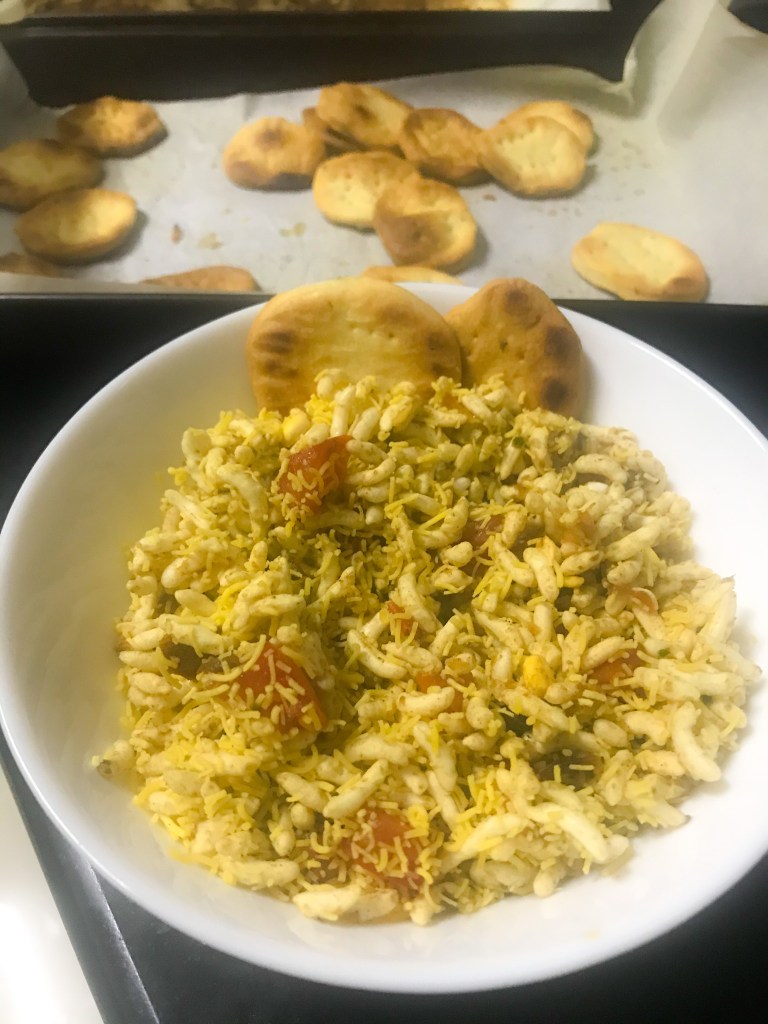 Papdi is similar to a crisp flat cracker. It is made with all purpose flour or whole wheat flour, some semolina, carrom seeds for taste, oil and salt. Since we are making it at home, it can be any size of our choosing. I like to make smaller ones when I make bhel puri, like in the picture above. If I make sev puri I like the papdi discs to be wider and slightly larger. This makes it easier to load it up with all the other elements of the chaat.