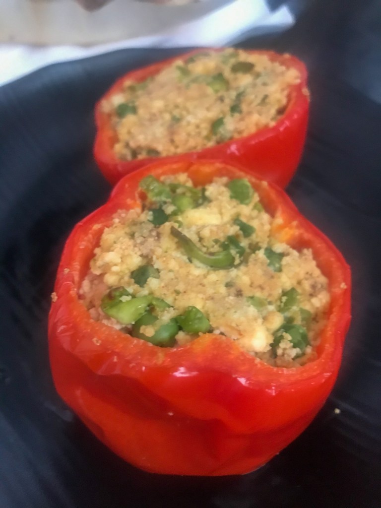 delicious paneer and peas stuffed capsicum which is then baked to be enjoyed
